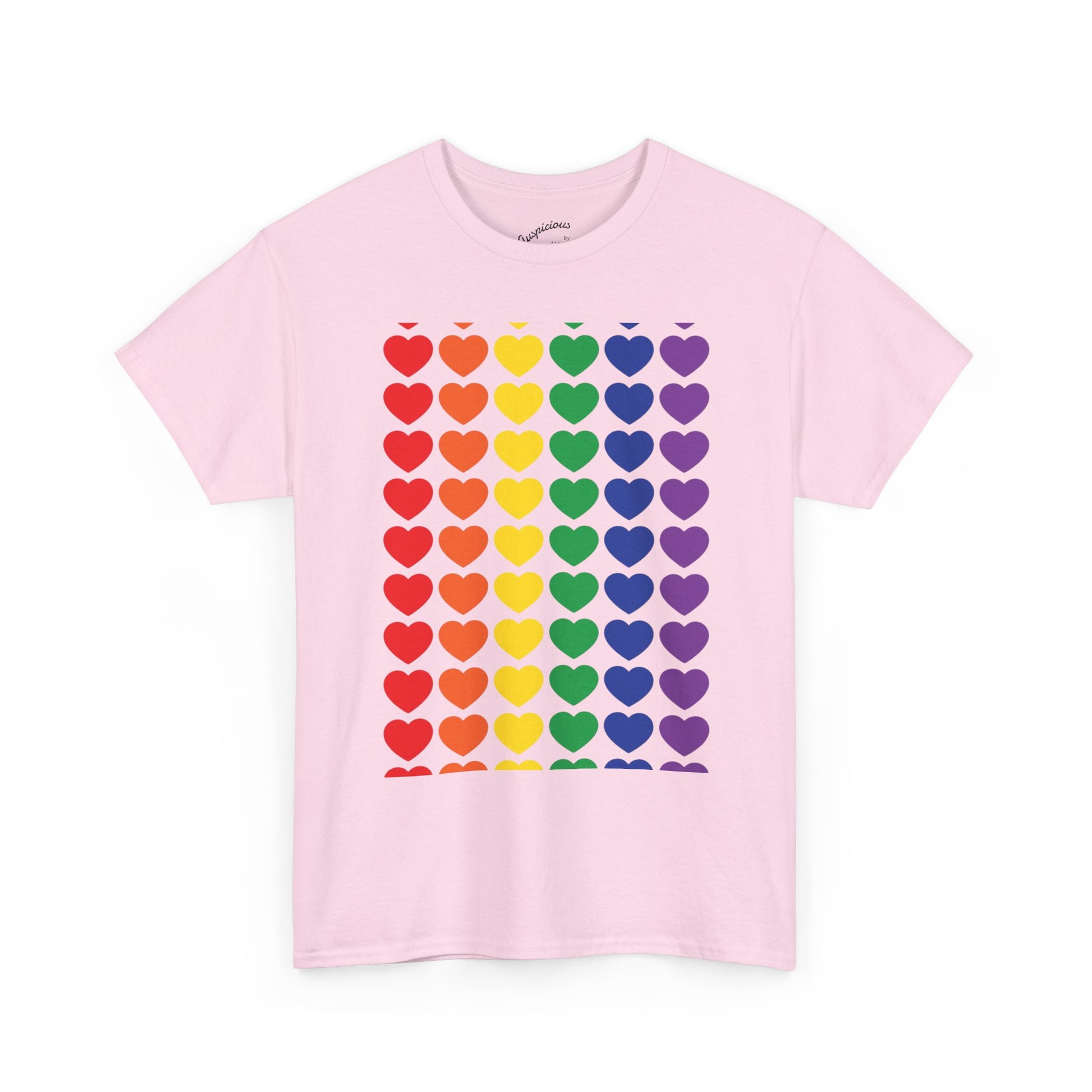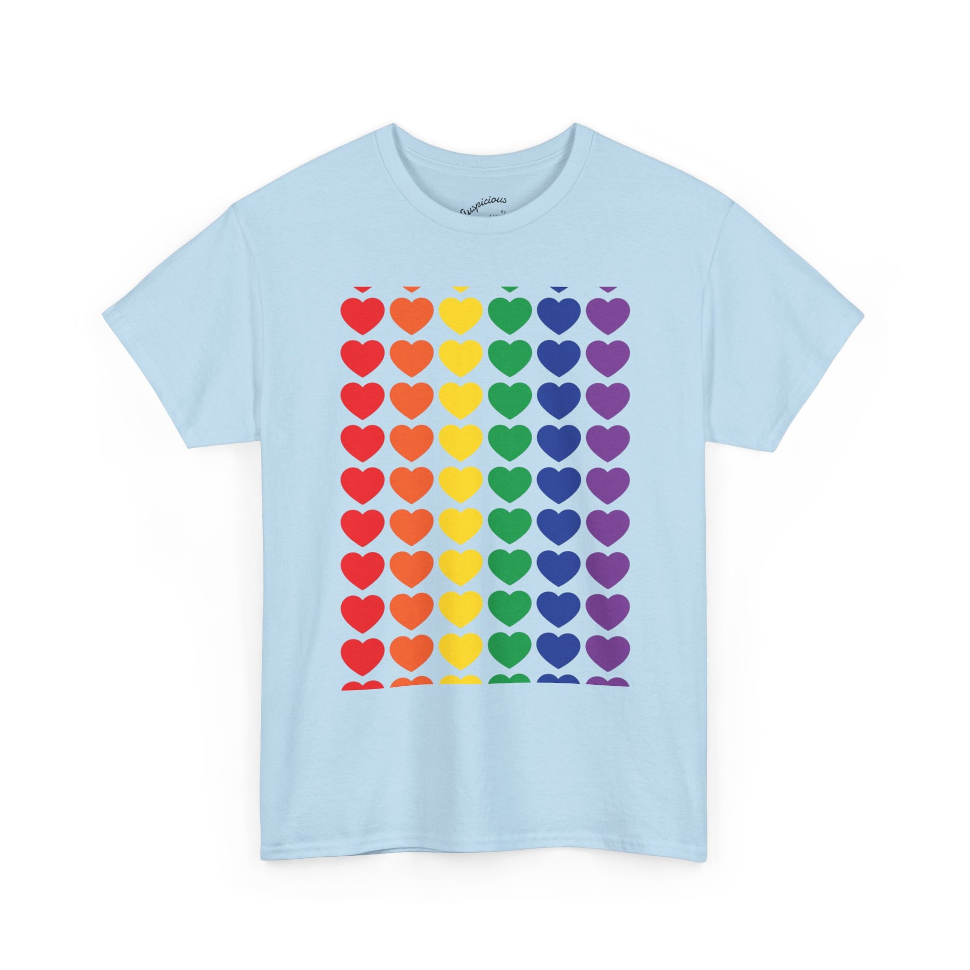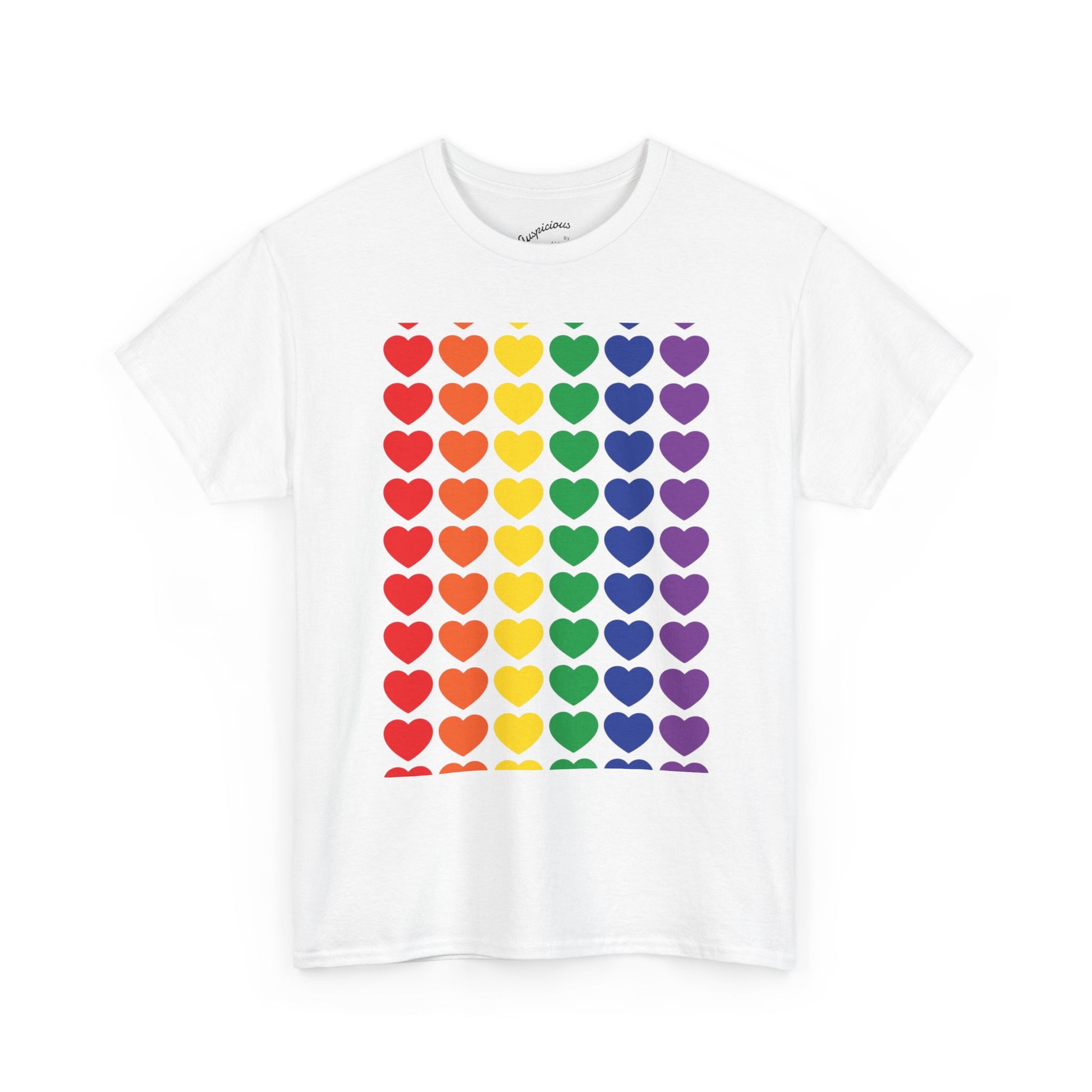 A soft, breathable cotton tee printed with a bold grid of rainbow hearts — bright, simple, and full of warmth. The classic crew neck and relaxed fit make it a comfortable layer for everyday wear, while the smooth, high-quality print keeps the colors vivid wash after wash. Wear it to show quiet solidarity, celebrate community, or add a cheerful pop to your weekend outfit. It sits easily under a jacket or on its own, turning ordinary moments into small declarations of joy and belonging.