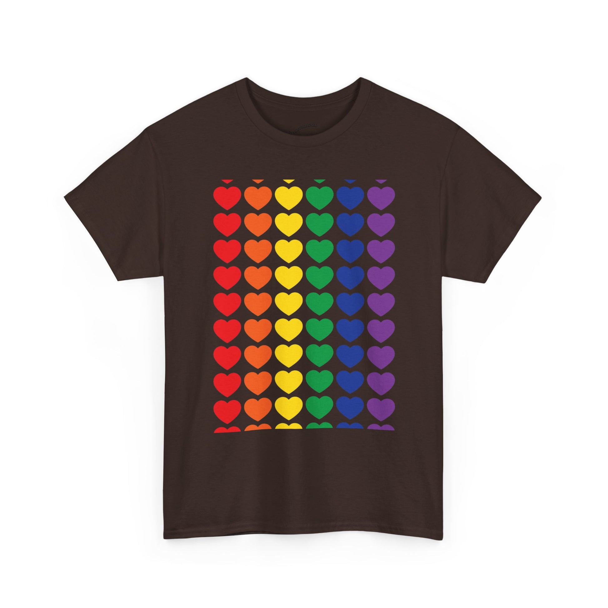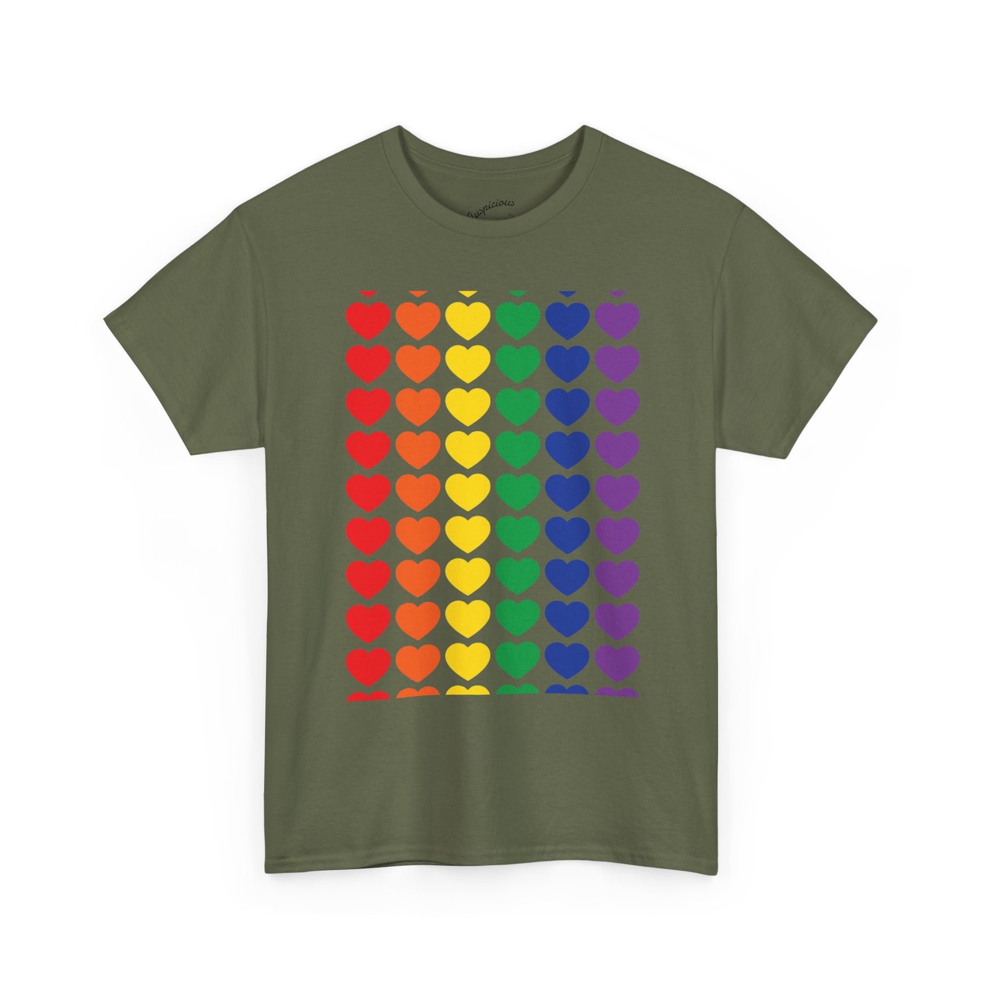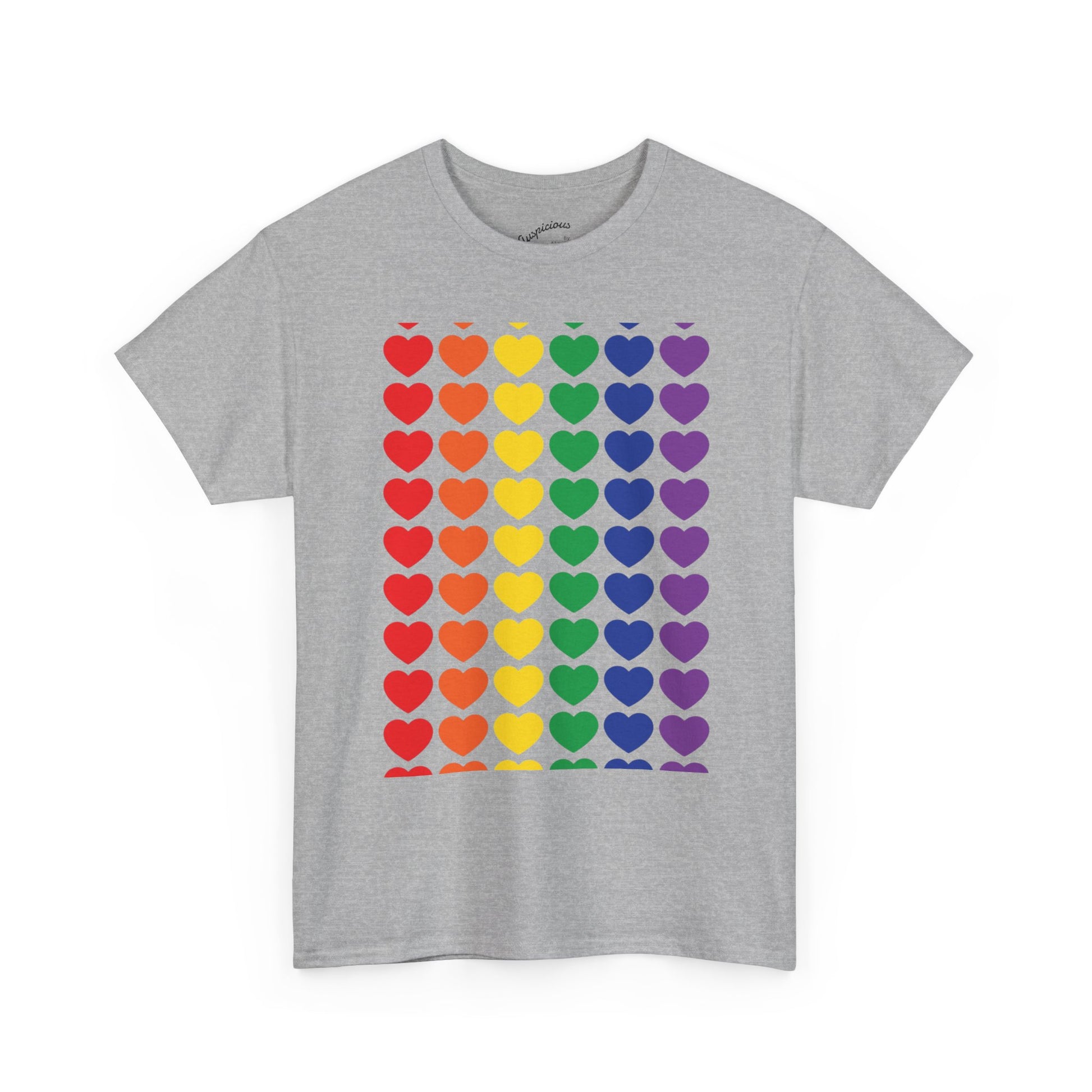 A soft, breathable cotton tee printed with a bold grid of rainbow hearts — bright, simple, and full of warmth. The classic crew neck and relaxed fit make it a comfortable layer for everyday wear, while the smooth, high-quality print keeps the colors vivid wash after wash. Wear it to show quiet solidarity, celebrate community, or add a cheerful pop to your weekend outfit. It sits easily under a jacket or on its own, turning ordinary moments into small declarations of joy and belonging.